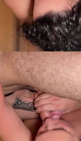 Brunette wife with big boobs gives blowjob