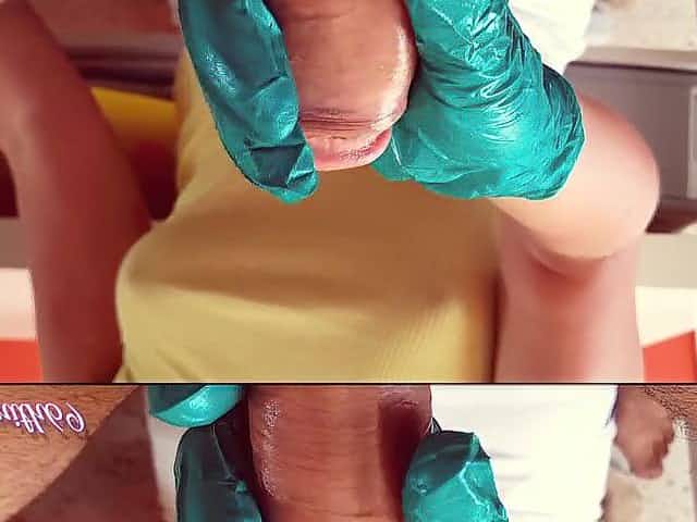 Giving him a safe and slow TUGJOB with green gloves and mask -- Slow CUM