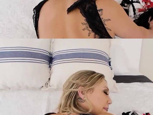 Lustful lesbians in sexy black lingerie eat out each other's pussies