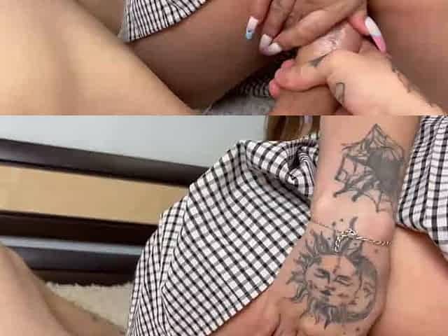 18 y/o super-cute woman gives dirty footjob, real orgasm. Big cock, nymph orgasm. Point of view sex, naked chick.