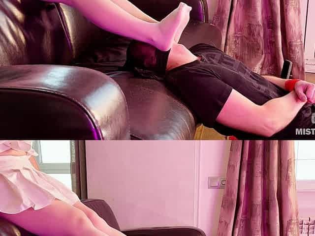 Mistress in White Tights Rubs Her Feet on the Slave's Face and Puts Toes in His Mouth