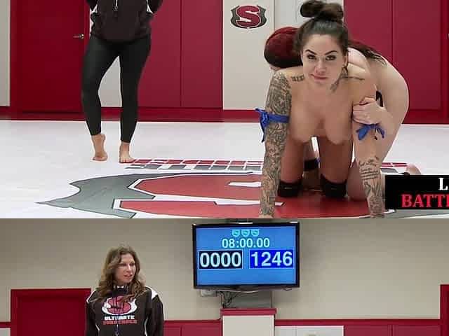 ULTIMATE SURRENDER - Wrestling dyke with small boobs fights busty MILF and wins