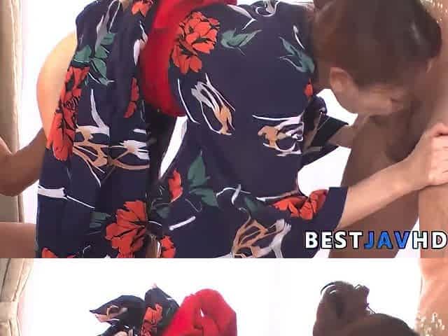 Slutty Japanese oral job on two stiff sausages by Kaori Maeda in uncensored XXX JAV!
