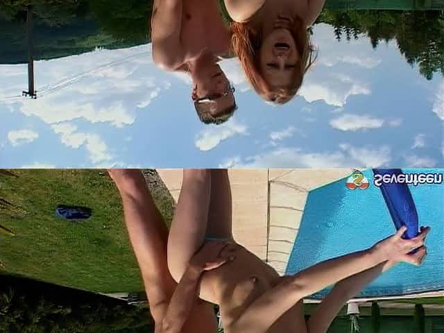 Redhead and bosomy teen gets screwed hardcore near the pool outdoors