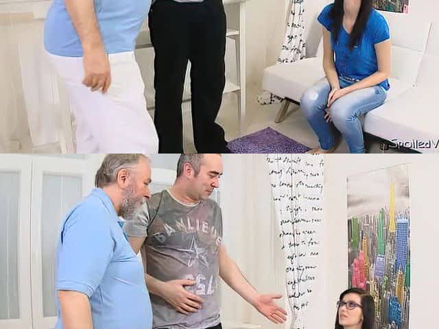 Two old guys argue if this cute teen girl in glasses is a virgin but anyway she gonna be spoiled