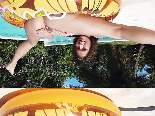 Aroused girl stands nude by the pool and wants to masturbate