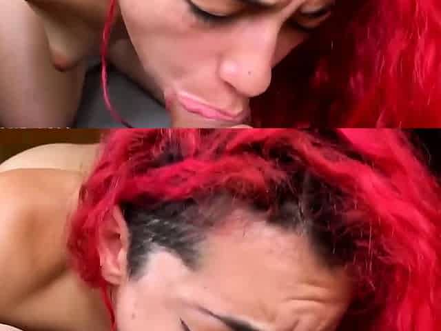 Sexy redhead deep throats and takes long black dick